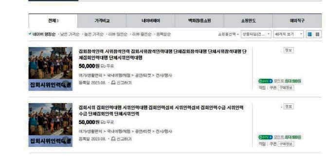 여러 전자상거래 플랫폼에 1인당 3만~5만원에 집회 알바를 구한다는 글이 올라왔다. 논란이 일자 각 플랫폼 업체는 해당 글을 삭제했다. 알바 구인 글을 올린 업체는 경기도에 있는 한 인력 대행사로 알려졌다. 앞서 한 지역 생활 커뮤니케이션 앱에도 ‘광화문 토요일 집회에 참여할 용모단정한 여학생 두 명 구한다’며 시급 1만30원을 내건 알바 구인 글이 올라왔다가 삭제됐다. 한 블로그에는 주어진 옷과 가면을 쓰고 사진과 영상을 촬영하는 조건으로 시급 1만2000원에 집회 알바를 구하는 글이 올라왔다. 집회에 금전적 대가를 주고 사람을