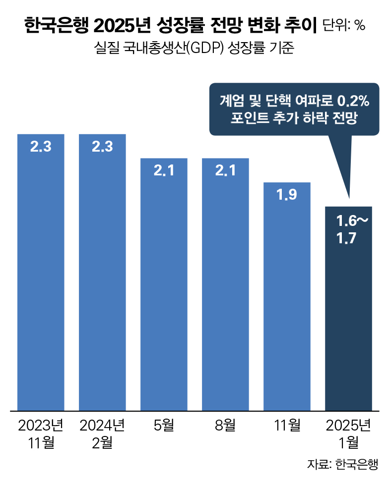 한국은행이 올해 연간 경제성장률이 1%대 중반에 그칠 것이라고 전망했다. 한은은 1월20일 공개한 ‘2025년 1월 금융통화위원회 결정 시 한은의 경기 평가’ 보고서를 통해 실질 국내총생산(GDP) 성장률 전망치를 이같이 수정했다. 지난해 11월 1.9% 성장할 것이라는 전망치가 약 두 달 만에 최대 0.3%포인트 하향 조정돼 1.6~1.7%로 주저앉은 것이다. 한은은 통상 매년 2, 5, 8, 11월에 성장률 등 경제전망 수치를 발표하는데 공식 발표를 앞두고 수정 전망치를 제시하는 건 매우 이례적이다. 그만큼 계엄·탄핵 정국의 여