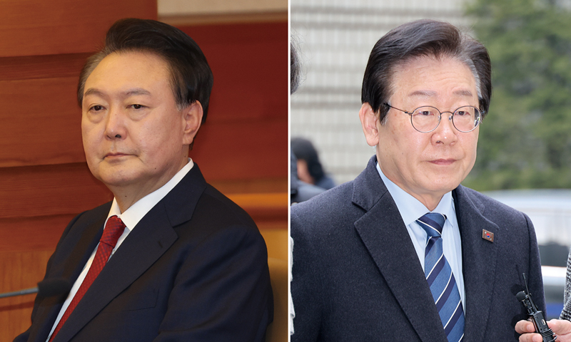 ‘탄핵의 강’에 빠진 현직 대통령과 ‘사법 리스크의 늪’에 놓인 제1야당 대표의 적대적 공생 관계가 흔들리고 있다. 윤석열 대통령의 탄핵심판과 이재명 더불어민주당 대표의 공직선거법 위반 재판이 본격적인 조기 대선 국면을 열어젖히면서다. 윤 대통령과 이 대표 모두 최대한 ‘운명의 시간’을 늦춰야 유리하다는 동일한 전략을 드러낸다. ‘탄핵 기각’ 또는 ‘2심 무죄’ 결과를 위한 벼랑 끝 법정 전투는 ‘재판 지연 전략’ 총동원령으로 이어질 전망이다. 관건은 5월이다. 정치권과 여론의 시선이 2·3·4월 법정 혈투를 거쳐 ‘5월 조기 대선