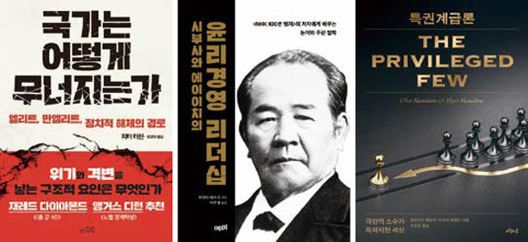 국가는 어떻게 무너지는가왜 모든 국가와 사회는 반복적으로 정치적 불안정에 시달릴까? 그중 많은 사회가 내전, 혁명이나 심각한 수준의 혼란을 겪으며 명멸한다. 저자는 세계 모든 대륙에서 발생한 수백 건의 위기 사례를 데이터베이스화하고, 복잡계 이론에서 성공했던 방법론을 적용해 ‘왜 사회가 반복적으로 위기에 빠지는지’에 관한 자신의 주장을 전개한다.피터 터친 지음|생각의힘 펴냄|424쪽|2만3800원 시부사와 에이이치의 윤리경영 리더십일본 근대 경제의 아버지 시부사와 에이이치의 경영철학을 다룬 평전. 그는 일본 최초의 은행 설립과 50