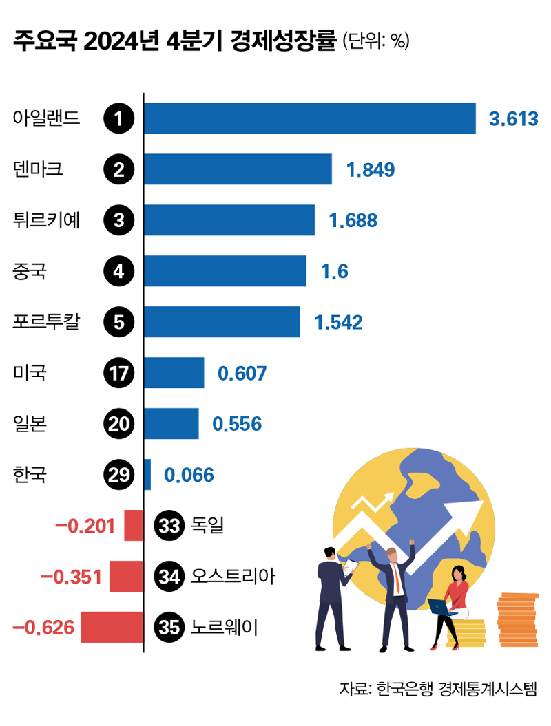 한국은행에 따르면 콜롬비아·리투아니아를 제외한 36개 경제협력개발기구(OECD) 회원국에 중국을 더해 작년 4분기 실질 국내총생산(GDP) 성장률(전분기 대비)을 조사한 결과, 한국(0.066%)은 전체 37개국 중 29위로 집계됐다. 한국의 세계 하위권 성장 성적표는 벌써 세 분기째 이어지고 있다.지난해 1분기 성장률은 1.3%로 중국(1.5%)에 이어 6위로 집계됐으나 2분기(-0.228%)에 32위로 추락했고, 3분기(0.1%)에도 뚜렷한 반등에 실패하면서 26위에 그쳤다. 소비·건설 투자 등이 살아나지 못하는 상태에서 지난해
