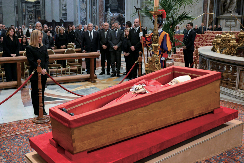 가톨릭의 제266대 프란치스코 교황이 부활절 이튿날인 4월21일 88세로 선종했다. 교황은 마지막 순간까지 “평화는 가능하다”는 희망의 메시지를 반복했다.4월23일(현지시간) 조르자 멜로니 이탈리아 총리가 바티칸 성 베드로 대성당에 안치된 교황 프란치스코에게 조의를 표하고 있다. 바티칸은 성 베드로 대성당을 일반에 개방해 각국 주요 인사와 신자들의 조문을 받았다. 4월23일(현지시간) 오전부터 3일간 진행될 조문을 위해 모여든 행렬. 관 앞을 지나는 조문객들은 짧은 기도를 올리며 교황의 마지막 길을 배웅했다.