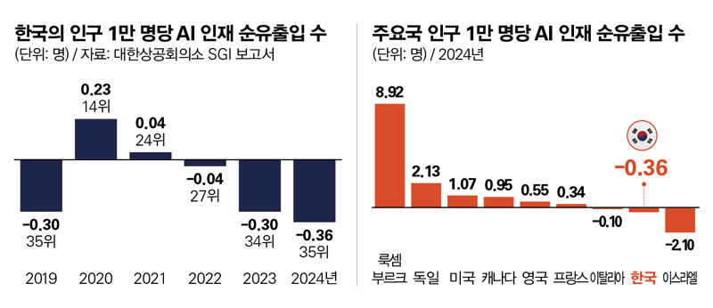 국내 인공지능(AI) 분야 고급 인력의 해외 유출이 심화되면서 이재명 정부의 ‘AI 3대 강국’ 공약 실현 가능성에 빨간불이 들어왔다. 업계에선 해외로 빠져나간 인재들을 다시 유턴시킬 대전환 정책이 필요하다는 지적이 나온다.대한상공회의소 SGI(지속성장이니셔티브)는 6월17일 ‘한국의 고급인력 해외유출 현상의 경제적 영향과 대응방안’ 보고서를 통해 2024년 한국에서 인구 1만 명당 0.36명의 AI 인재 순유출이 발생했다고 밝혔다. 이는 경제협력개발기구(OECD) 38개국 중 35위의 규모다.국내 전문인력의 해외 취업은 2019년