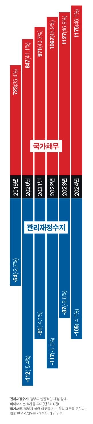 갚아야 할 빚이 많다면 어떻게 할까? 보통사람이라면 돈을 아껴 쓸 것이다. 빚을 갚으려고 노력할 것이다. 돈을 꼭 써야 할 상황이라면 ‘필요한 지출인지’를 몇 번이고 곱씹을 것이다. 가계와 나라 살림은 다르긴 하다. 하지만 빚을 대하는 자세는 근본적으로 같다. 그런데 이재명 정부는 집권하자마자 돈 쓸 생각부터 먼저 한다.이 정부가 6월19일 발표한 내용이 그렇다. 민생회복지원금 10조원을 국민에게 나눠주겠다고 했다. 부자에게도 15만원 정도 나눠준다고 한다. 하지만 고소득자에게는 이 돈이 큰 의미가 없다. “그 돈 안 줘도 된다”는
