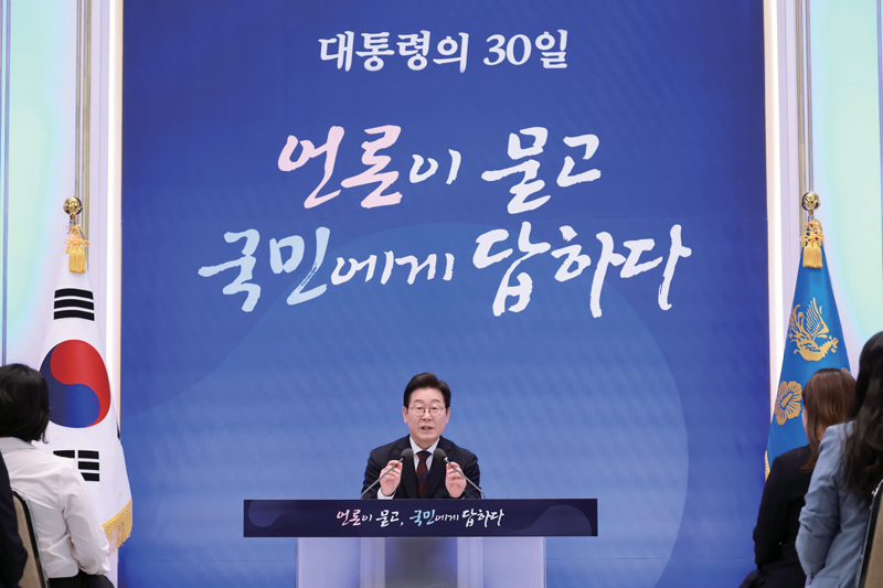 취임 한 달 만에 이례적으로 열린 이재명 대통령의 기자회견은 ‘형식’부터 ‘내용’까지 기존의 틀을 깼다. 연단 없는 타운홀 미팅 방식, 즉석 질의응답, 프롬프터 없이 풀어낸 발언을 통해 ‘소통’과 ‘실용’을 강조한 이 대통령은 민생 회복과 경제 안정에 국정의 우선순위를 두고 있음을 거듭 밝혔다.이 대통령은 ‘실용주의’라는 국정 기조를 토대로 “진영 없이” “대화와 토론이 먼저”라며 협치의 메시지를 강조했지만, 동시에 “대출 규제는 맛보기” “통일 언급은 시기상조” “색깔로 인사를 배제해선 안 된다” 등 입장이 명확한 사안에 대해선