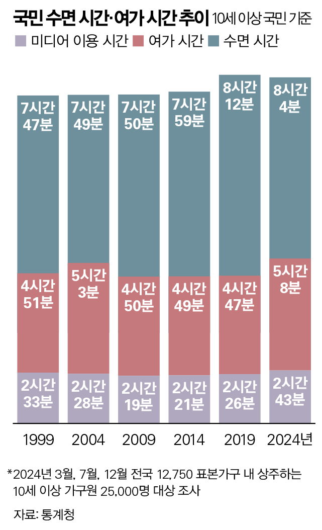 한국인의 평균 수면 시간이 통계 작성 이후 처음으로 감소한 것으로 나타났다. 통계청이 5년 주기로 실시하는 ‘생활시간 조사’에 따르면, 지난해 10세 이상 국민의 하루 평균 수면 시간은 8시간4분으로, 5년 전보다 8분 감소했다. 1999년 첫 조사 이후 수면 시간은 맨 처음 7시간47분으로 시작해 꾸준히 증가해 2019년에는 8시간12분에 도달했으나, 이번에 처음으로 감소세가 확인됐다. 일과 학습에 사용하는 시간도 함께 줄어든 반면, 미디어 이용 시간은 크게 늘어났다.구직 활동을 포함한 하루 평균 일하는 시간은 3시간7분, 학습