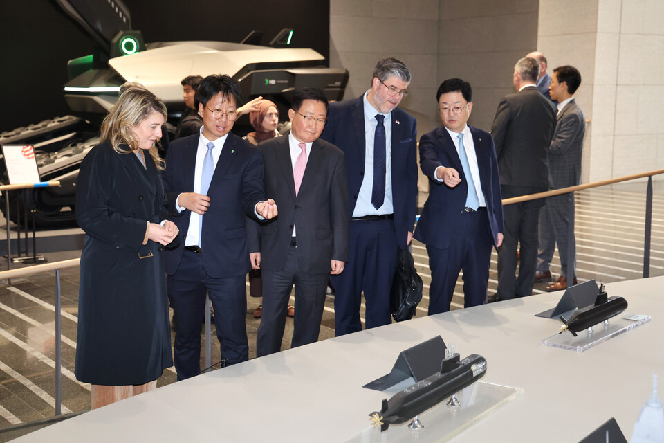 멜라니 졸리 캐나다 산업부 장관이 경기도 성남 HD현대 글로벌R&D센터(GRC)를 찾아 상호 협력 방안을 논의했다. 내년 최종 사업자 선정을 앞둔 캐나다 잠수함 프로젝트에서 HD현대중공업·한화오션 공동 수주에 청신호가 켜졌다는 분석이 나온다.HD현대는 25일 졸리 장관이 GRC를 방문해 HD현대의 잠수함 등 조선 역량을 확인하고, 경제·산업 분야에서 상호 포괄적인 협력 방안을 모색했다고 밝혔다. 졸리 장관은 이날 HD현대의 미래형 선박과 잠수함, 호위함, 무인수상정 등의 모형을 둘러보고, 조석 HD현대 부회장, 주원호 HD현대중공업