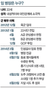실제 군 관계자와 임 병장 부모의 말을 종합하면, 임 병장은 GOP에 투입된 후 병영 생활에 제대로 적응하지 못했다. 매사에 절도 있고 민첩한 행동을 요구받았지만, 임 병장은 따라가지 못했다는 것이다. 병장으로 진급해서도 부대원들로부터 제대로 고참 대접을 받지 못해 불만이 쌓여갔던 것으로 보인다. 군이 임 병장 부대원들을 대상으로 실시한 1차 면접조사에서는 “임 병장이 자주 열외됐다” “단체생활을 못하고 소수하고만 어울렸다” “선임병들에게 왕따를 당했고, 후임병한테 인정을 못 받았다” 등의 증언이 나왔다. 임 병장의 GOP 생활이 그리 원만하지 않았음을 짐작할 수 있다.