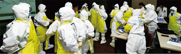 에볼라 유입을 차단하기 위해 한국 정부는 서아프리카에 의료진을 파견하기로 했다. 대한의사협회가 구성한 신종감염병 대응 전담반은 격주로 전체 의사 회원에게 에볼라 최신 동향을 배포하고 있다. 국립중앙의료원도 전담반을 조직해 진료에 대비하고 있다. 그러나 이런 의지만으로는 부족하다는 연구 결과가 나왔다. 기모란 국립암센터 국제암대학원대학교 예방의학과 교수는 최근 학술지(‘역학과 건강’)에 첫 에볼라 관련 논문을 게재했다. 논문에 따르면 미국 등 선진국에서는 방역복을 입은 의사와 검사 전문가가 한 공간에서 환자를 치료하고 각종 검사를 한다. 이때 의료진과 검사 인력은 방역복에 달린 공기 튜브를 통해 외부 공기만으로 숨을 쉰다. 기 교수는 “국내 격리 병상은 인플루엔자와 같은 호흡기 감염병을 가정해 만든 시설이다. 에볼라처럼 혈액·체액 등으로 전파되는 경우를 고려해 환자가 격리된 곳에서 환자의 혈액·체액 등 모든 가검물을 검사할 수 있도록 설계된 병상은 없다”며 “에볼라 환자의 가검물은 환자의 격리 병상 밖으로 절대 나가선 안 되는데, 국내 병원에선 격리 병상에서 채취한 에볼라 환자의 가검물을 외부로 보내 검사해야 하는 형편”이라고 지적했다. 독감 바이러스가 유행하는 겨울철을 맞아 진단에 어려움이 생길 것이라는 전망도 나왔다. 김우주 교수는 “독감 바이러스와 에볼라의 초기 증상이 고열·기침 등 비슷해서 감별이 쉽지 않아 초동 대처에 미흡할 수 있다”며 “의료진은 만일의 경우를 생각해 환자를 진단해야 한다”고 주문했다.