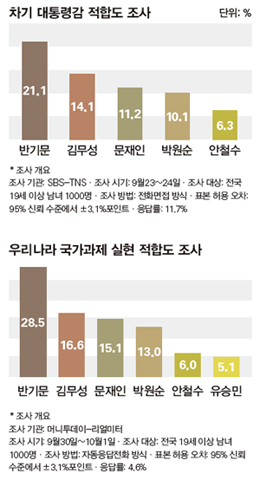 우리나라의 국가과제를 실현하는 데 적합한 인물이 누구인지에 대한 머니투데이-리얼미터 여론조사에서도 반 총장은 최근 1위에 올랐다. 단순 차기 대선 주자 지지율과 약간 다른 각도에서 물은 조사다. 향후 시대정신에 맞는지, 또 그러한 과제를 실현할 역량이 있는지를 알아본 것이다. 이 조사에서 반 총장은 28.5%였다. 2위는 김무성 대표로 16.6%, 3위는 박원순 서울시장 15.1%, 4위는 문재인 대표 13.0%, 5위는 안철수 의원 6.0%, 6위는 유승민 의원 5.1%였다.