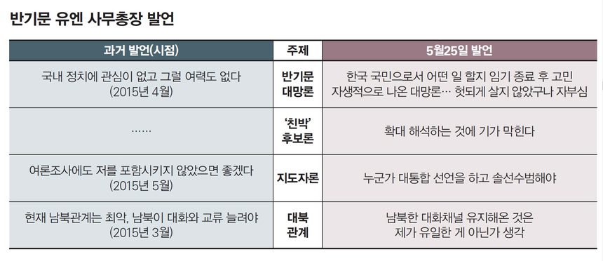 “많은 이들은 반 총장이 그간 어떤 경우에도 ‘출마 않겠다’는 말을 하지 않은 것을 아주 못마땅해하는데 거기엔 사연이 있다. 여러 지인들이 ‘어떤 상황이 벌어질지 모르는 미래를 단정하는 것은 바람직하지 않다’고 누누이 당부했기 때문이다. 대충 요약하면 ‘반 총장 당신께서 유엔의 수장이 된다고 생각하거나 기대한 적이 있는가. 하지만 총장이 됐다. 그러니 미리 자신의 발목이나 잡을지 모를 공언을 하는 것은 현명치 않다’는 것이다.