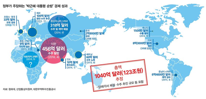 박근혜 대통령의 세일즈 외교 성과는 어마어마했다. 20여 차례의 순방을 통해 얻은 경제 성과는 무려 123조원 수준에 달했다. 정부 측 주장으로는 그랬다. 이명박 전 대통령의 자원외교 성과와는 비교도 안 될 규모였다.