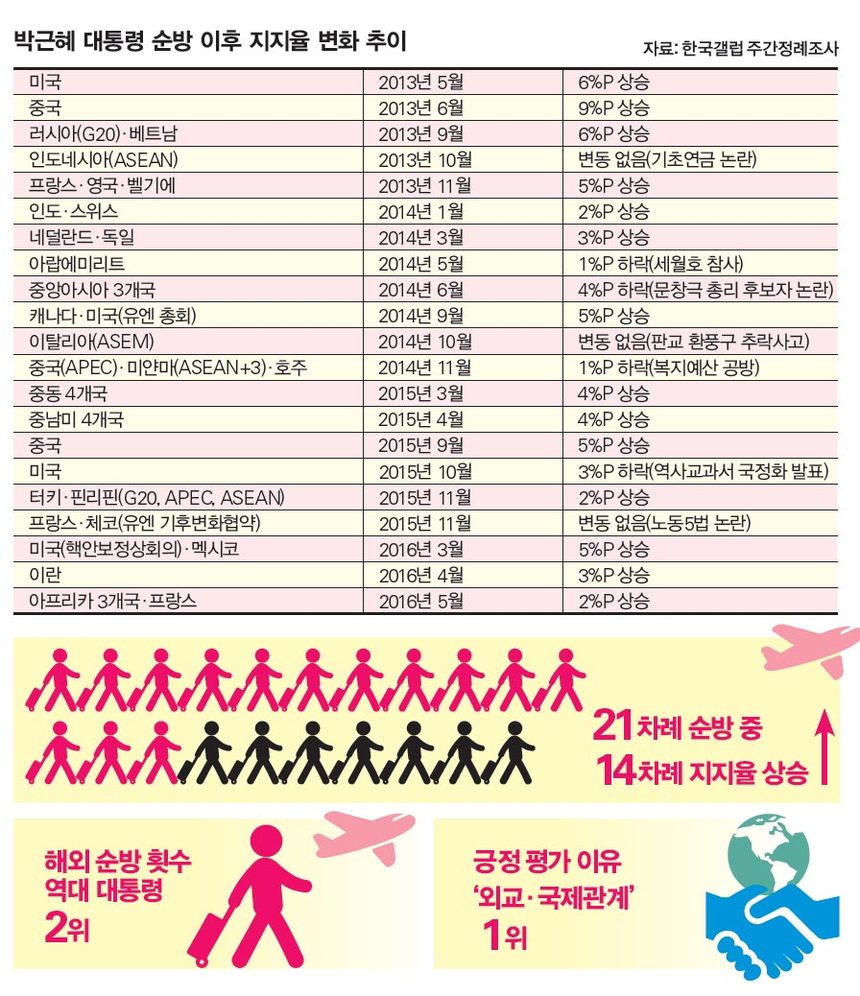 실제로 매주 박근혜 대통령의 국정지지율 조사를 실시하는 한국갤럽의 결과를 분석해봤다. 그동안 22차례 순방을 다녀온 직후 긍정 평가가 늘어난 경우는 14차례나 됐다. 취임 첫해 중국을 방문했을 때에는 무려 전주에 비해 9%포인트까지 치솟기도 했다. 지지율 변동이 없거나 하락한 6차례 순방의 경우 ‘대형 악재’를 만났을 때였다. 세월호 침몰 사고가 발생했거나 문창극 국무총리 후보자 논란이 벌어졌을 때, 판교 환풍구 추락 사고가 일어났을 때와 비슷한 경우였다. 한국갤럽이 5월27일 발표한 박 대통령의 국정지지율은 셋째 주보다 2%포인트 상승한 32%를 기록했다. 이번 아프리카 3국·프랑스 순방 효과가 영향을 미쳤다는 분석이다.