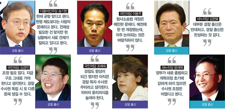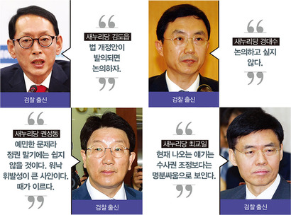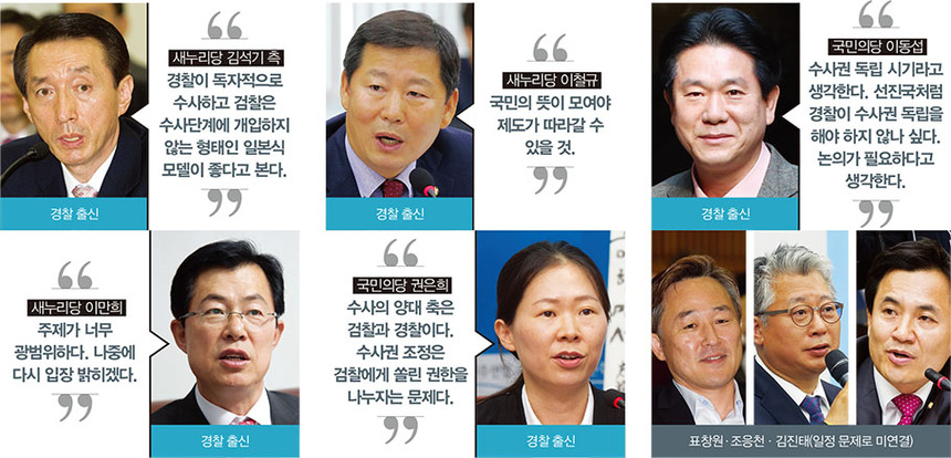 경찰 출신 새누리당 의원들은 말을 아꼈다. 김한표 의원은 “검찰 출신 의원들은 대부분 (수사권 조정을) 반대하고 경찰 출신들은 찬성하는 것 같다”며 더 이상 의견을 내지 않았다. 경찰청 정보국장과 경기지방경찰청장을 역임한 윤재옥 의원은 “정부 차원에서 의지를 가지고 해야 할 문제”라며 “수사권 조정 논의가 이슈가 된다면 입장을 밝히겠다”고 말했다. 2011년 수사권 조정 이슈가 불거졌을 때 경찰 측의 한 축을 담당했던 이철규 의원도 “제도란 결국 민의에 따라가는 것”이라며 “때가 된다면 입장을 밝히겠다. 지금은 어떻게 말해도 오해만 살 것”이라고 말했다.