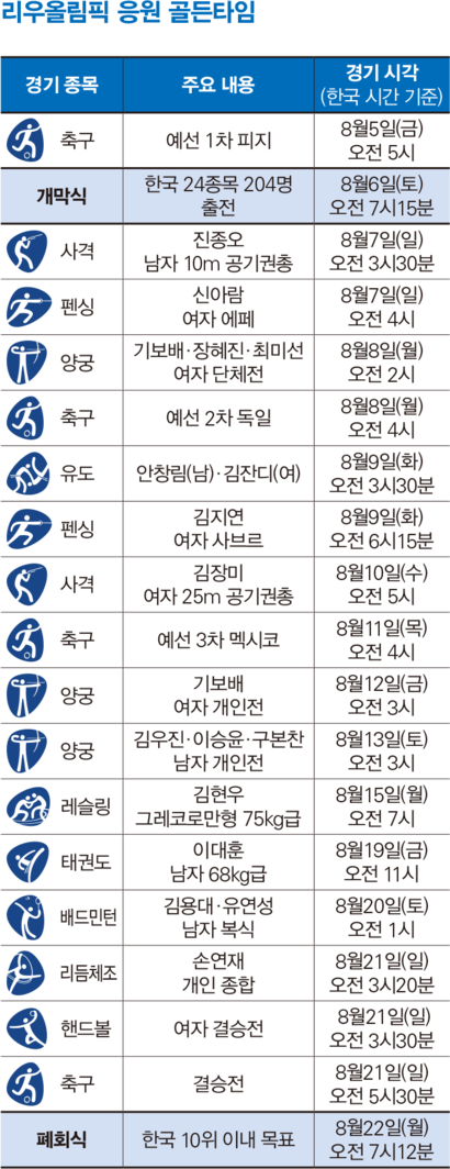 하지만 스포츠팬이라면 올림픽은 분명 놓치기 어려운 대회다. 국내를 대표하는 스타플레이어들은 물론 육상 단거리 황제 우사인 볼트(30·자메이카), ‘드림팀’이라 불리는 미국 남자 농구대표팀까지…. ‘리우올림픽 놓쳐서는 안 될 응원 골든타임’을 엄선해 소개한다. 앞으로 소개할 종목의 시간은 모두 한국 기준이다.