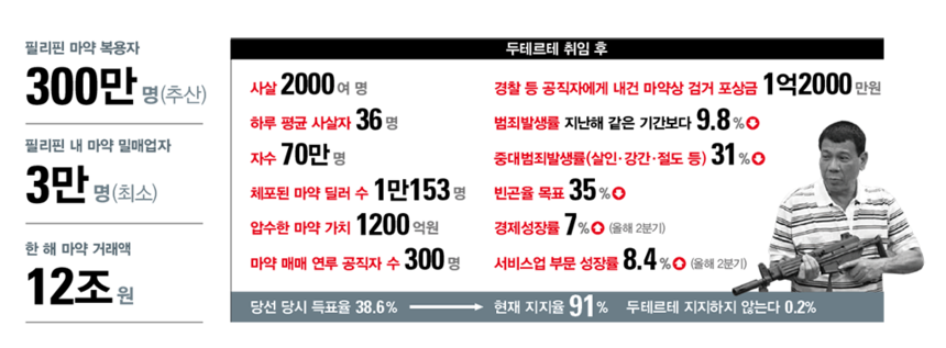 마약범 2000명이 죽었고, 70만 명이 자수했다. 법보다 주먹을 내세운 두테르테는 세계적 인물이 됐다. 그는 ‘새로운 변화’를 필리핀에 가져올 것이라고 약속하며 선거에서 승리했지만 그의 통치는 필리핀의 피플파워를 불러왔던 페르디난드 마르코스 시절을 떠올리게 한다.