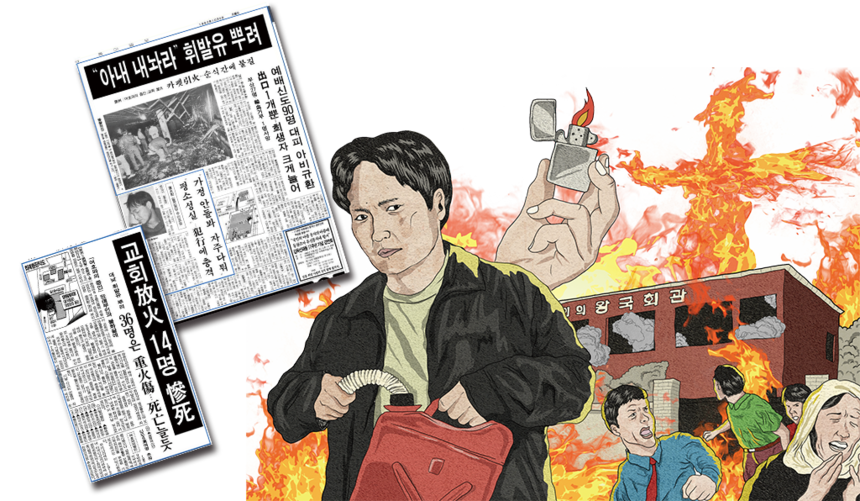 갑작스러운 원씨의 등장에 놀란 신도들은 “부인은 오지 않았다”며 모른 체했다. 그러자 격분한 원씨는 한쪽 손에 들고 있던 휘발유통을 거꾸로 세우고는 예배당 계단과 안쪽에 마구 뿌렸다. 그래도 신도들이 관심을 보이지 않자 원씨는 “끝내 아내를 내놓지 않으면 교회를 불태워버리겠다”고 말한 뒤 라이터로 불을 붙였다.