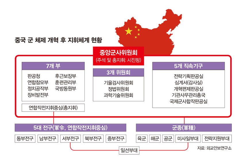 이런 문제점을 시정코자 중국은 2016년 1월 ‘국방과 군대 개혁 심화에 관한 의견’을 발표하고 일련의 개혁 작업을 실시했다. 4대 총부를 해체해서 중앙군사위 아래 7개 부, 3개 위원회, 5개 직속기구를 신설했다. 야전은 7대 군구에서 5대 전구로 조정하고, 기능을 연합작전지휘사령부로 바꿨다. 각 전구사령부에서 육·해·공군 및 미사일부대를 지휘토록 해서 미군과 비슷한 체제를 만들었다. 물론 지난 30여 년 동안 여러 차례 군 개혁은 있어 왔다. 하지만 병력 감축과 무기 현대화에 초점을 맞췄을 뿐이다.