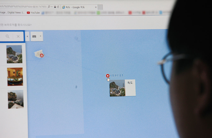 5년이 지난 현재는 어떨까. 기자는 1월19일 구글의 지도 서비스에 접속해 독도를 찾아봤다. 과거와 달리 ‘독도’와 ‘동해’라는 글자가 한눈에 들어왔다. 하지만 키워드 검색으로 ‘독도’를 검색하자 다른 결과가 나왔다. ‘독도’ 대신 ‘리앙쿠르 암초’에 깃발 표시가 돼 있었다. 이 글자를 누르자 비로소 사진과 함께 독도로 표기가 바뀌었다.