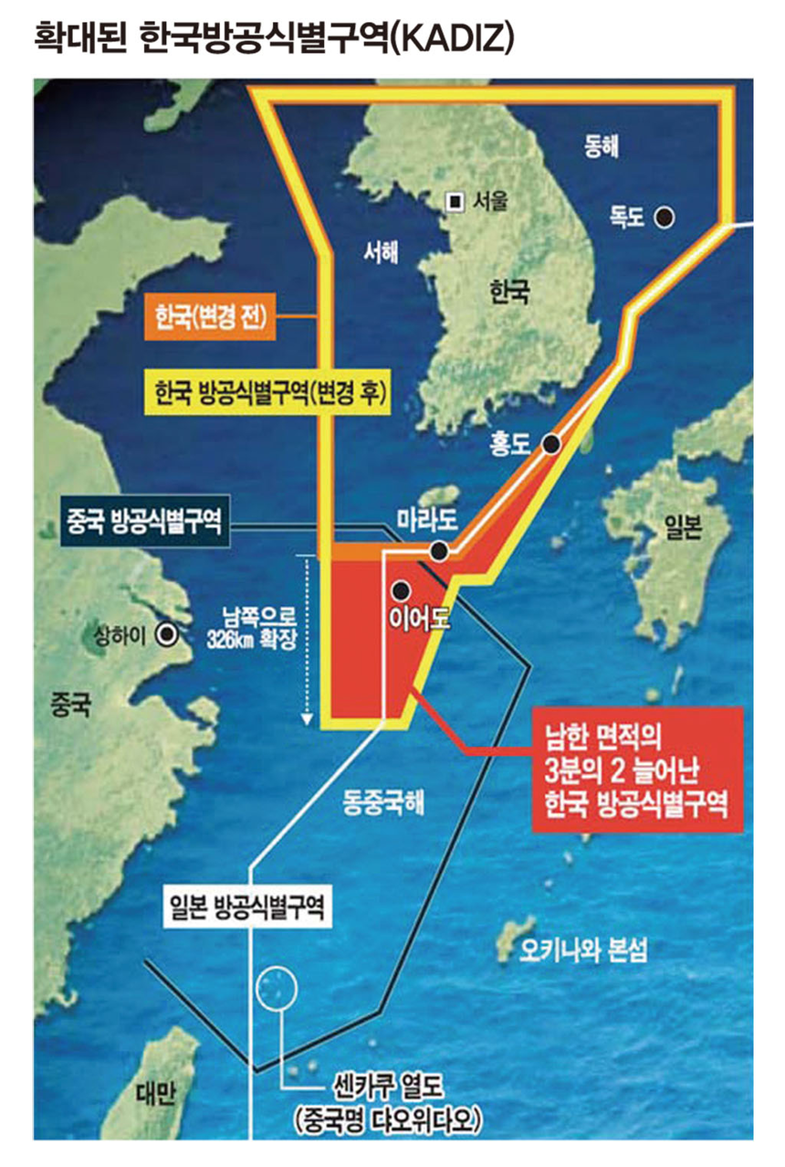 문제는 정작 우리의 KADIZ에는 이어도가 포함되지 않고 있었다는 점이었다. KADIZ가 처음 설정되던 1951년 당시 이어도는 물론이고, 심지어는 영해인 마라도 12해리 앞까지도 포함되지 않았다. 우리 정부는 처음에는 중국과 대화로 해결하려고 했으나, 대화가 이루어지지 않자 과감하게 이어도와 나머지 영해까지 모두 포함하도록 KADIZ를 확장한 것이다. 다만 대화에 응했던 미국 및 일본과는 상의를 했고, 대화를 거부한 중국에는 일방적 통보만을 했다. 결국 CADIZ 확장과 이에 대항한 KADIZ 확장, 여기에다 기존에 설정되어 있던 일본방공식별구역(JADIZ)까지 겹치면서 이어도 인근지역은 한·중·일 3국의 방공식별구역이 겹치는 민감한 지역으로 바뀌어버린 것이다.