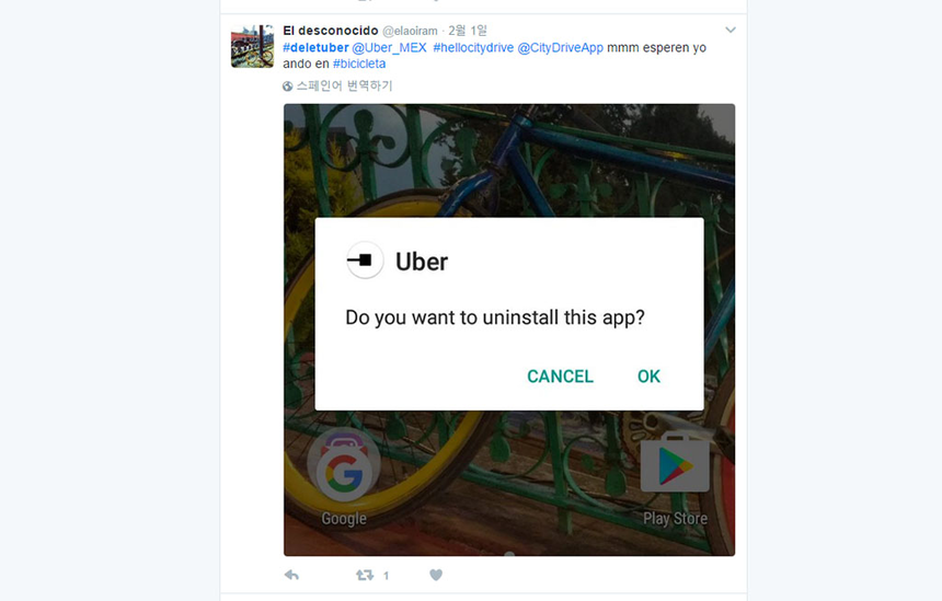 우버 계정을 삭제한 페이지 스크린샷이 분노의 트윗과 함께 떠돌았다. 이런 일도 있었다. 트럼프가 행정명령을 발표하자 1만9000명 규모의 뉴욕택시노동자연합(NYTWA)가 항의하고 나섰다. 그들은 JFK 공항과 뉴욕 시내를 오가는 걸 중지하겠다고 했다. 반면 우버는 이 시기에 영업활동을 계속했다. 오히려 “수요가 높을 때 생기는 가격 인상은 없다”며 공세적으로 나섰다. 이런 배신의 영업과 칼라닉 CEO의 트럼프 자문단 참여가 합쳐져 시너지를 발휘하며 우버는 하나 둘 스마트폰에서 삭제됐다. “이민자 거부에 대한 항의를 이용해 돈벌이를 한 우버는 최악”이라는 이야기가 SNS를 타고 흘렀다.