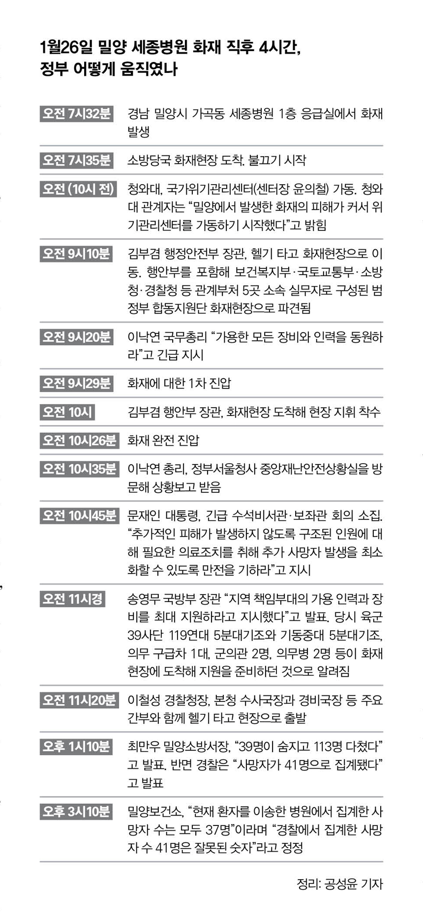 1월26일 경남 밀양시 세종병원에서 발생한 화재로 인해 대형 인명 피해가 났다. 이날 화재로 37명이 목숨을 잃는 등 188명의 사상자가 발생했다. 당직의사 1명, 간호사 1명 등 직원 3명도 목숨을 잃었다. 제천 스포츠센터 화재로 29명의 목숨이 희생된 지 36일 만이다.