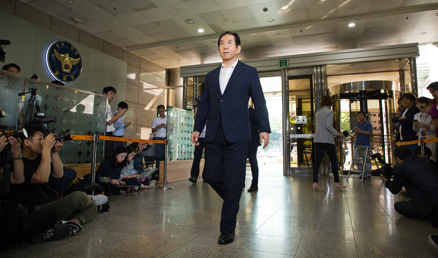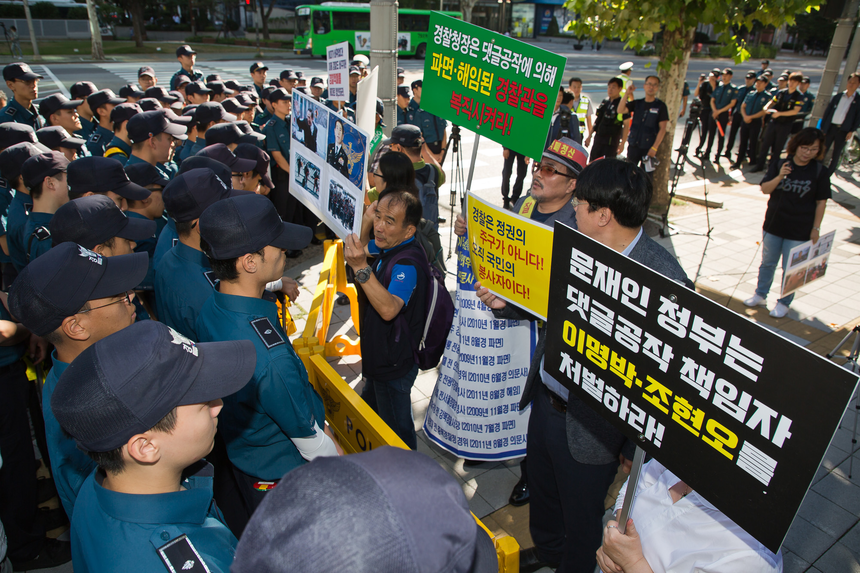 이명박 정부 시절 경찰의 댓글공작을 총 지휘한 혐의를 받고 있는 조현오 전 경찰청장이 피의자신분으로 조사를 받기 위해 5일 오전 서울 서대문구 미근동 경찰청으로 출석하고 있다. 같은 시각 경찰청 정문 앞에서 쌍용차 해고노동자들과 시민들이 이명박 전 대통령과 조 전 청장의 처벌을 촉구하는 집회를 열었다.