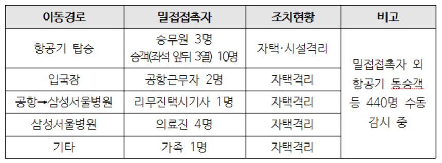 A씨의 아내와 택시운전사, 의료진 및 항공기 탑승객 등 21명은 현재 메르스 환자 밀접접촉자로 분류돼 자택격리 중이다. 이들은 최대 잠복기인 14일 동안 자택에서 격리되며 지역 보건소 담당자의 모니터링을 받는다. 이들 외 항공기 동승객 440명도 일상접촉자로서 감시 선상에 놓였다. 이들은 격리되진 않지만, 관할보건소의 정기적 연락을 받게 된다.