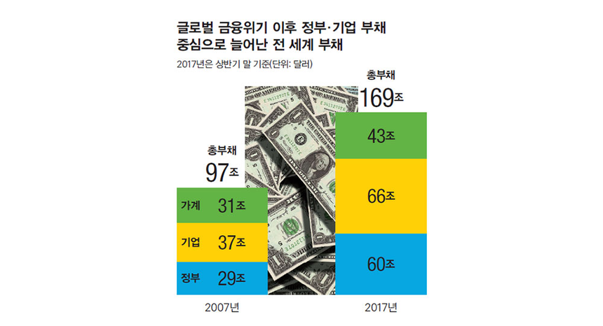 세계는 지난 10년 동안 더 안전해졌고, 더 위험해졌다. 금융 시스템은 더 안전해졌지만, 금융 자본의 탐욕은 여전하다. 전대미문의 돈이 풀려 세계경제는 조금씩 진정되고 있지만 지구촌 빚더미는 오히려 커졌다. 글로벌 컨설팅 업체 맥킨지 분석에 따르면, 글로벌 금융부채(비금융기업과 정부, 가계 빚을 합한 금액)는 2007년 97조 달러로 당시 GDP의 207%였다. 2017년 상반기 기준 전 세계 부채 규모는 169조 달러, GDP의 236%로 불어났다. 중국의 빚은 10년 새 다섯 배로 늘어나 약 30조 달러에 이르렀다. 한국의 가계와 정부의 빚은 각각 두 배로 증가했다.