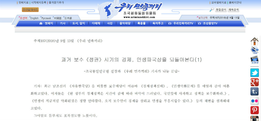 조국평화통일위원회 산하 대남(對南)선전매체 ‘우리민족끼리’는 9월13일 조국통일연구원 실장과의 대담기사를 통해 남한 사회의 이면을 적나라하게 비판했다. 제목은 ‘과거 보수 정권 시기의 경제, 민생파국상을 되돌아본다’이다.