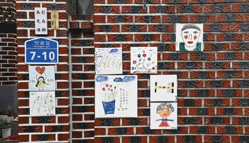 “어르신들이 타일에 그린 그림들을 각자의 집 앞에 붙여 전시해 놓고 있다. 향교리 집 앞 ‘한켠 갤러리’다. 투박한 문패에도 색을 입혔다. 어르신들의 그림에는 자식에 대한 미안함과 남편에 대한 애정 등이 담겨 있다. 할머니들은 맞춤법이 틀린 글도 직접 그림 옆에 쓰신다. 그 문구에도 삶의 관록과 감성이 그대로 묻어나온다. ‘비가 오고 해가 뜬께 무지개가 있는 거여.’ 직접 쓰신 문구다. 얼마나 멋진가.”