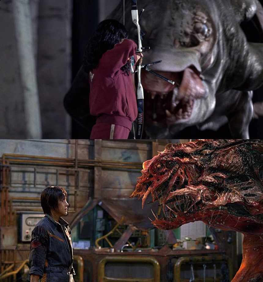봉준호가 만든 괴물은 관객으로 하여금 ‘뭔가 엄청난 걸 보고 있구나’란 감흥을 안기는 외형이었고, 《디 워》는 작품적 평가와 별개로 이무기 위용 면에서 적지 않은 볼거리를 제공했었다. 할리우드의 그 유명한 괴수 에이리언과 프레데터는 캐릭터 자체의 힘으로 《에일리언 vs 프레데터》란 파생 영화까지 불러들인 경우. 그에 반해 《물괴》의 괴수는 무섭다거나 괴기하다기보다 뭐랄까, 생김새가 일단 비호감이라는 점에서 바라보는 심경이 복잡해진다. 괴물의 매력을 겨루는 대회가 있다면 조기 예선 탈락이지 않을까.