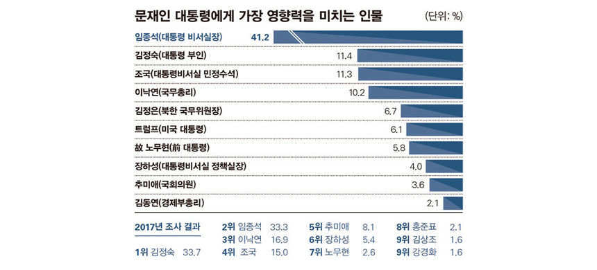 지난해 같은 조사에서 김정숙 여사에 이어 2위를 차지했던 임 실장은 올해 김 여사와 자리를 맞바꿨다. 각각 33.7%, 33.3%로 지목률이 비등했던 지난해와 달리, 그는 이번 조사에서 41.2%를 얻어 11.4%에 그친 2위 김 여사와 큰 차이를 뒀다. 문재인 정부 중반기로 접어든 지금 청와대 내 그의 장악력이 날로 막강해지고 있음을 보여주는 대목이다.