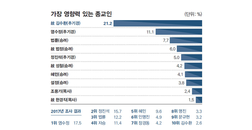 2010년 3월11일 입적한 법정 스님과 1993년 11월4일 입적한 성철 스님이 각각 4위와 6위에 올랐다. 무소유의 삶을 실천했던 법정 스님은 우리 곁을 떠나는 모습도 청빈과 끊임없는 수행으로 일관한 생전과 마찬가지로 맑고 향기로웠다. 20세기 한국 불교를 대표하는 성철 스님은 독보적인 사상과 철저한 수행으로 조계종 종정에 오르면서 불교계에 새로운 지평을 열었다는 평가를 받는다. 종교학자이자 베스트셀러 작가인 혜민 스님과 최근까지 조계종 총무원장을 맡았던 설정 스님이 각각 7·8위에 이름을 올렸다. 개신교계에서는 여의도순복음교회의 조용기 원로목사와 영락교회의 고(故) 한경직 원로목사가 각각 9·10위를 차지했다.