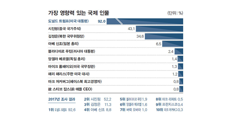 국제 인물 조사의 전반적인 흐름도 예년과 다르지 않았다. 미국·중국·일본·러시아 등 주로 한반도 정세와 관련된 국가의 정상들이 상위권에 올랐다. 시진핑 중국 국가주석(43.1%)과 김정은 북한 국무위원장(34.6%)이 트럼프 대통령의 뒤를 이으며 순위에 큰 변동은 없었다. 눈길이 가는 인물은 1위를 기록한 트럼프 대통령과 3위를 기록한 김 위원장이다. 김 위원장의 지목률은 지난해 11.3%에서 올해 34.6%로 3배가 훌쩍 뛰었다.