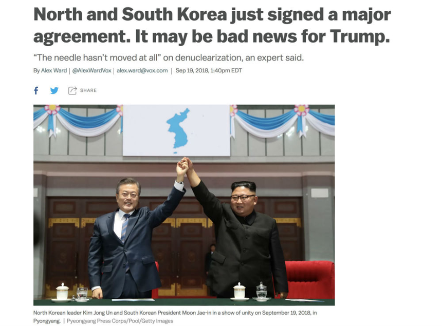 9월18일부터 평양에서 열린 3차 남북 정상회담에서 국제 사찰단과 함께 핵 시설을 폐쇄한다는 내용이 발표됐다. 이는 언뜻 보기엔 큰 진전으로 보이지만, 이는 미국의 종전 선언을 전제로 하므로 비핵화에 실질적인 진전은 없었다는 시각이 미국 매체에서 제기됐다. 미국 인터넷매체 Vox는 9월19일(현지 시각) "이번 남북 정상회담의 합의가 매우 모호한 게 문제"라며 "트럼프에겐 나쁜 소식"이라고 평가했다.