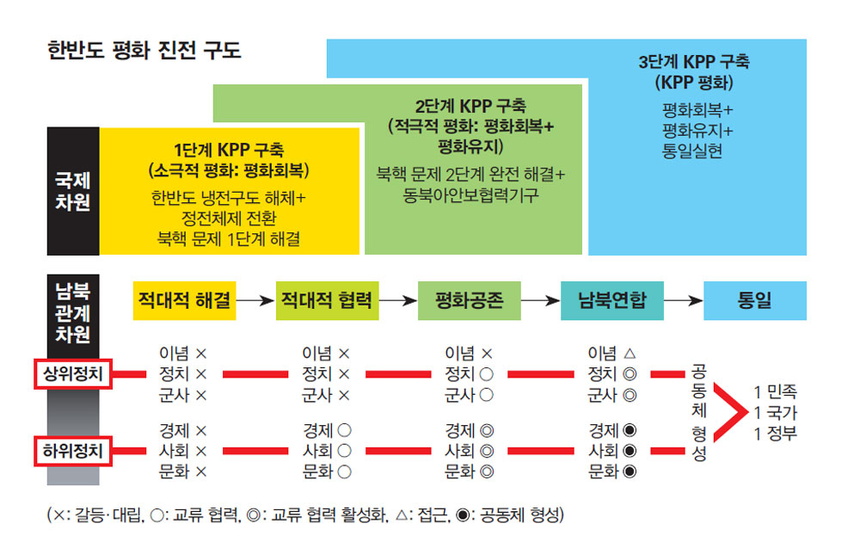 한반도 평화 진전 구도의 기본 틀은 지난 30년간 지속되어 온 우리의 공식적 통일방안으로서 국가대전략이라 할 수 있는 ‘민족공동체통일방안’이다. 민족공동체통일방안은 남북관계의 진전을 크게 ‘남북화해협력’→‘남북연합’→‘통일’의 세 단계로 상정하고 있다. 첫 번째 단계에조차 진입하지 못하고 있는 현실에서 국내외 상황에 부응하는 동시에 정책 목표를 실천적으로 상정하기 위해 남북화해협력을 ‘적대적 대결’→‘적대적 협력’→‘평화공존’의 세 단계로 세분화할 수 있다. 한편 국가 간의 관계 형성에 있어 교류협력의 형성이 상대적으로 어려운 이념·정치·군사 분야를 상위정치(high politics) 영역으로, 상대적으로 용이한 경제·사회·문화 분야를 하위정치(low politics) 영역으로 구분할 수 있다.