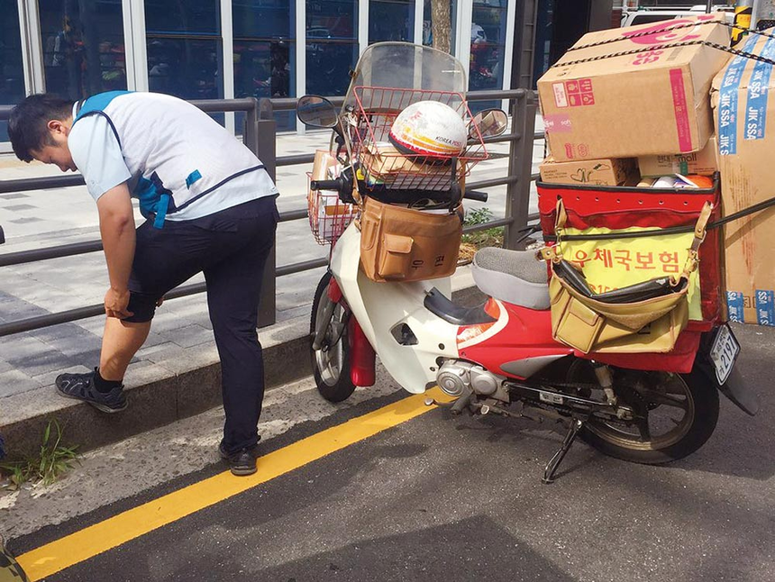 “그래도 아파트는 편한 거예요.” 오후 1시를 넘긴 시각, 이씨는 길음동 주택가 배달을 시작했다. 주택가는 아파트처럼 세대들이 모여 있지 않다. 그는 오토바이에서 내려 빌라 계단을 올랐다. 택배를 전달하고, 다시 내려와 오토바이에 올라탔다. 또다시 5m를 움직이고, 오토바이에서 내렸다. 어느새 그의 새까만 긴바지는 땀에 절어 엉덩이와 허벅지 살갗에 달라붙었다. 그렇게 이씨는 그날 우편물 1500여 건, 등기 및 택배 150여 건을 배달했다. 거리로는 40km를 움직였다.