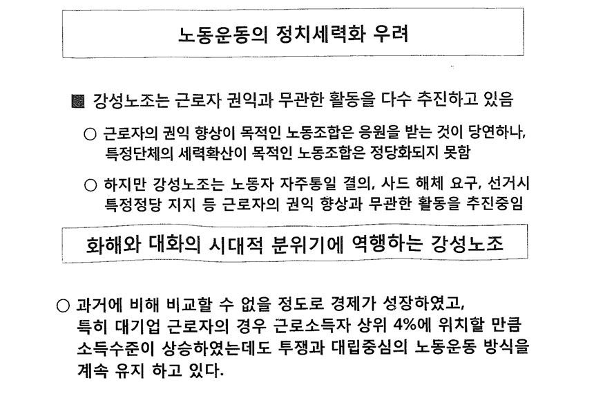 ‘화해와 대화의 시대적 분위기에 역행하는 강성노조’라는 문건에는 “상급단체는 취약계층의 노동기본권 개선보다 빠른 시간 내 많은 조합원 확보가 가능한 대기업 조직화에 집중하고 있다”는 식의 내용도 포함됐다.