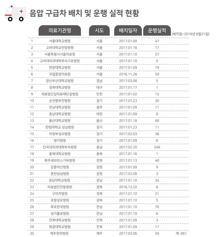 보건복지부가 국회 보건복지위원회 소속 김명연 자유한국당 의원실에 제출한 자료에 따르면, 지난해 1월부터 올 8월까지 30대의 음압 구급차가 운행한 실적은 모두 881회다. 의료기관 1곳당 약 29회(1달에 약 2.4회) 사용한 셈이다.
