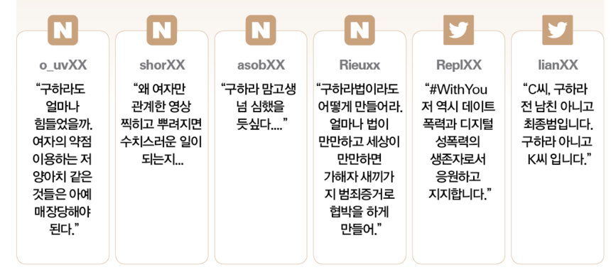폭행뿐만 아니었다. 전 남자친구 최종범씨와 폭행 시비에 휘말린 가수 겸 배우 구하라는 최씨를 강요·협박·성폭력 처벌 등에 관한 특례법 위반으로 추가 고소했다. 10월4일 매체에 따르면, 최씨가 구하라와 교제 당시 찍어뒀던 성관계 영상을 빌미로 구씨를 협박했다는 의혹이 제기되고 있다. 당일 구하라가 최씨 앞에서 무릎을 꿇은 영상이 공개되면서, 리벤지 포르노 범죄를 강력 처벌하란 여론이 거세지고 있다.