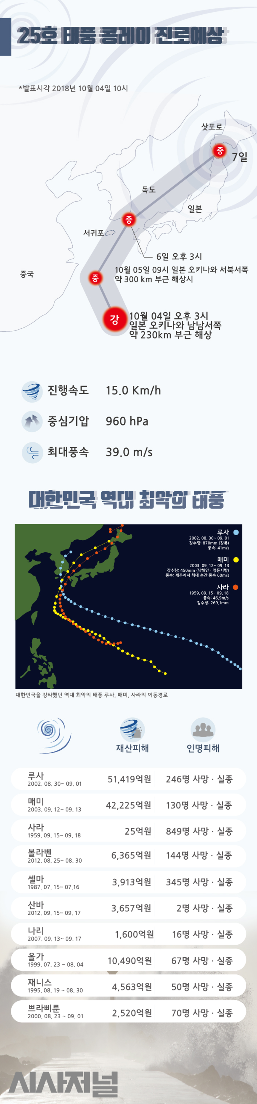 25호 태풍 ‘콩레이’가 빠르게 북상하면서 제주도 먼 바다에는 10월 5일 오전 7시 태풍주의보가 발령됐다. 시사저널은 태풍 '콩레이'의 예상 이동 경로와 함께 최근 한반도를 크게 강타했던 역대 태풍들의 이동 경로와 피해 상황 등을 확인해보았다.