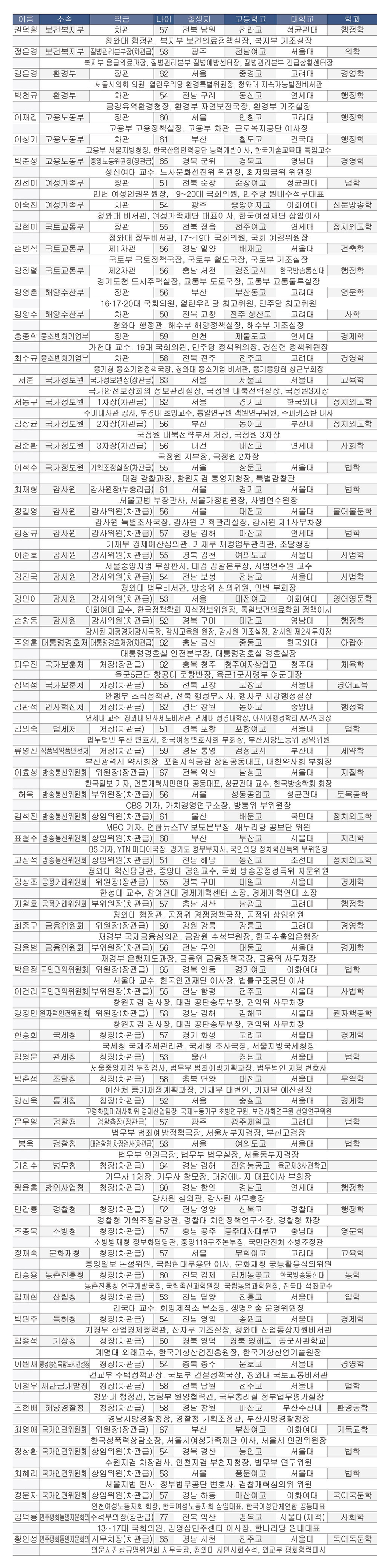 시사저널은 문재인 정부 2기 내각의 차관급 이상 고위 관료를 전수 조사했다. 2기 내각은 여러 가지 면에서 특징을 갖고 있다. 시사저널은 지난해 말부터 올 9월까지 교체된 장관 또는 차관급 등 고위 공직자 인사를 분석한 결과를 한 단어로 요약하면 ‘시·운·전(고시·운동권·전라도 출신)’으로 결론내릴 수 있다. 문재인 정부 고위관료 명단은 다음과 같다.
