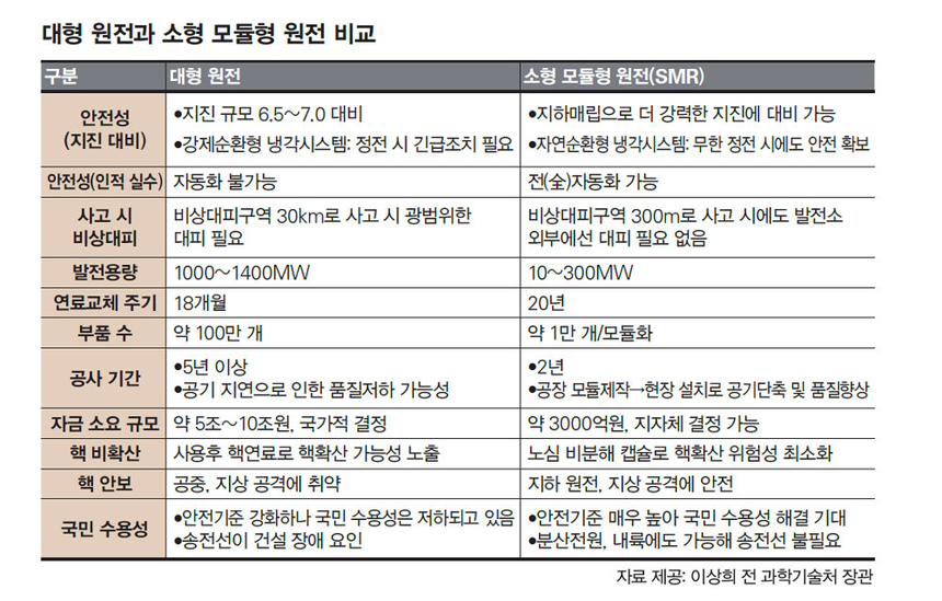 국제원자력기구(IAEA)의 정책 흐름도 바뀌었다. 원전의 안정성과 중·소형화에 방점이 찍혔다. 그러면서 잊을 만하면 한 번씩 대형 참사를 빚은 대형 원전이 아닌 소형 모듈형 원전(Small Modular Reactor·SMR)에 대한 관심이 늘었다. 대형 원전과 SMR 즉 소형 원전은 발전용량으로 구분한다. 발전용량이 10~300메가와트(MW)면 소형 원전, 1000~1400MW면 대형 원전으로 분류된다.