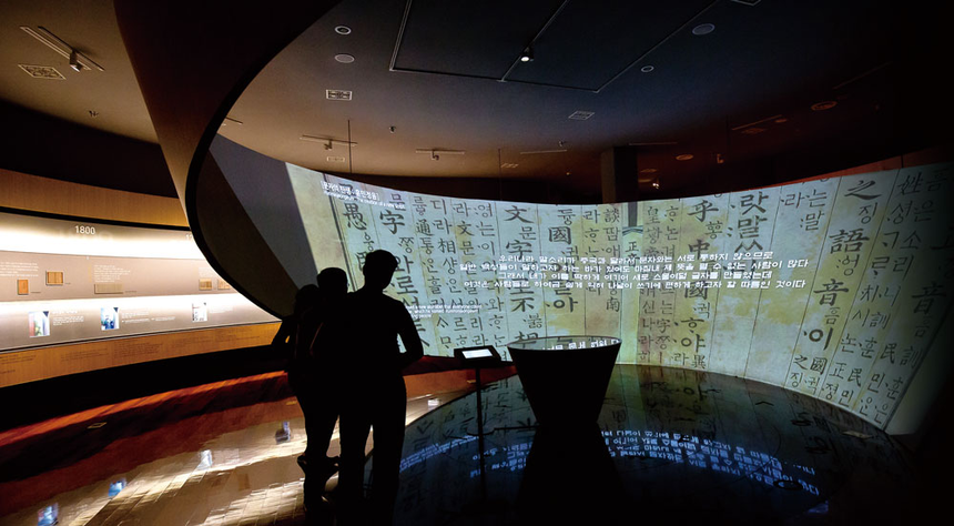 10월1일 서울 용산구에 위치한 국립한글박물관에서 관람자들이 《훈민정음》 해례본 영상물을 감상하고 있다. ⓒ 시사저널 임준선