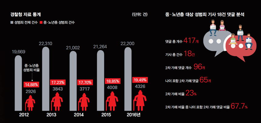 중·노년층 피해자가 겪는 2차 피해를 알아보기 위해 중·노년층의 성폭력 피해를 보도한 기사 18건의 댓글 총 417개를 분석했다. 90대 여성을 상대로 성폭행을 시도한 사건과 70대 여성을 성폭행하려다 숨지게 한 30대 남성에 대한 기사 등이다. 한국여성상담센터의 검토를 거친 결과 2차 가해 댓글이 총 댓글의 23%였고, 그중 68%에는 피해자의 나이에 대한 언급이 포함돼 있었다.