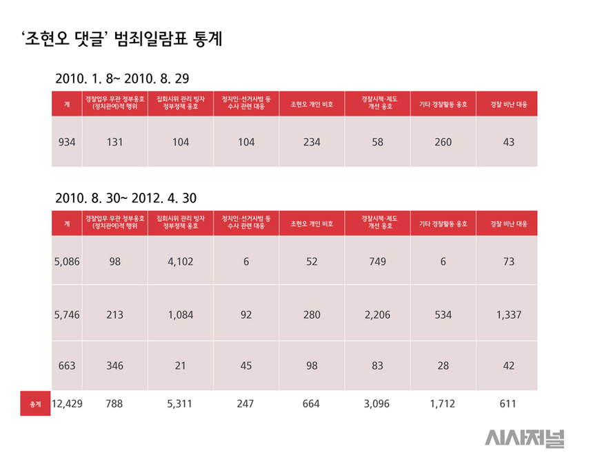 시사저널은 ‘집회·시위 관리 빙자 정부정책 옹호’와 관련해, 주요 집회·시위에 얼마만큼의 댓글이 달렸는지 분석했다. 대상 기간은 조 전 청장이 서울지방청장으로 재직한 시기를 제외한 2010년 9월부터 2012년 4월까지다. 전체 경찰에 영향력을 미칠 수 있었던 때가 경찰청장 재임 기간이기 때문이다. 또한, 댓글의 유형도 포털사이트와 트위터로 나눠서 살펴봤다. 트위터는 포털사이트의 댓글보다 더 큰 파급력이 있는 것으로 볼 수 있다.