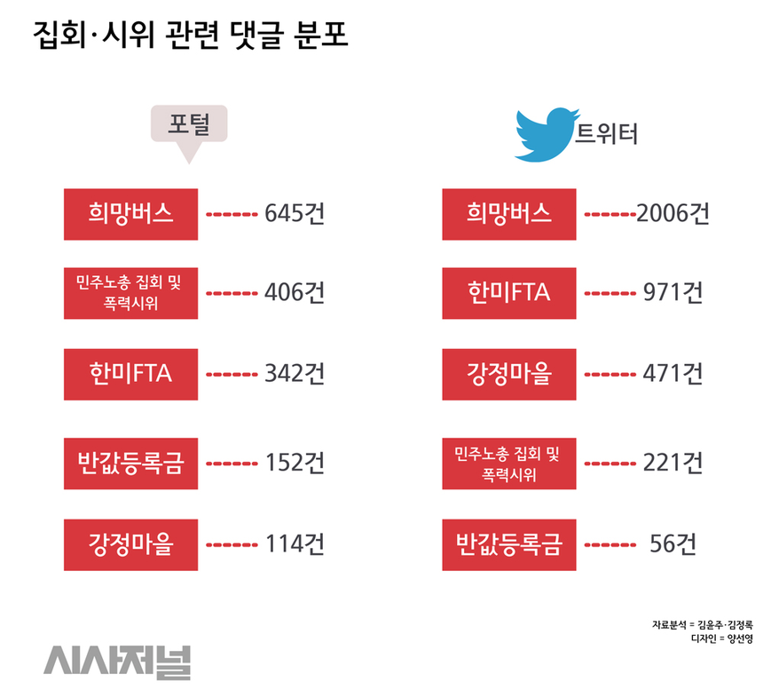 포털사이트 댓글의 경우 한진중공업 희망버스가 1위(645건)를 차지했다. 희망버스는 트위터에서도 2006건으로 1위를 기록했다. 이는 집회·시위 댓글의 절반에 육박하는 수치다. 포털사이트에서 2위(406건)에 오른 민주노총 시위는 트위터에서는 4위(221건)를 기록했다. 한미FTA 비준반대 시위는 포털사이트(342건)와 트위터(971건)에서 각각 3위와 2위를 기록했다. 반값등록금 촉구 시위는 댓글에서 152건으로 4위(트위터 5위‧56건), 강정마을 해군기지 반대 시위는 트위터에서 471건으로 3위(포털사이트 5위‧114건)를 차지했다.