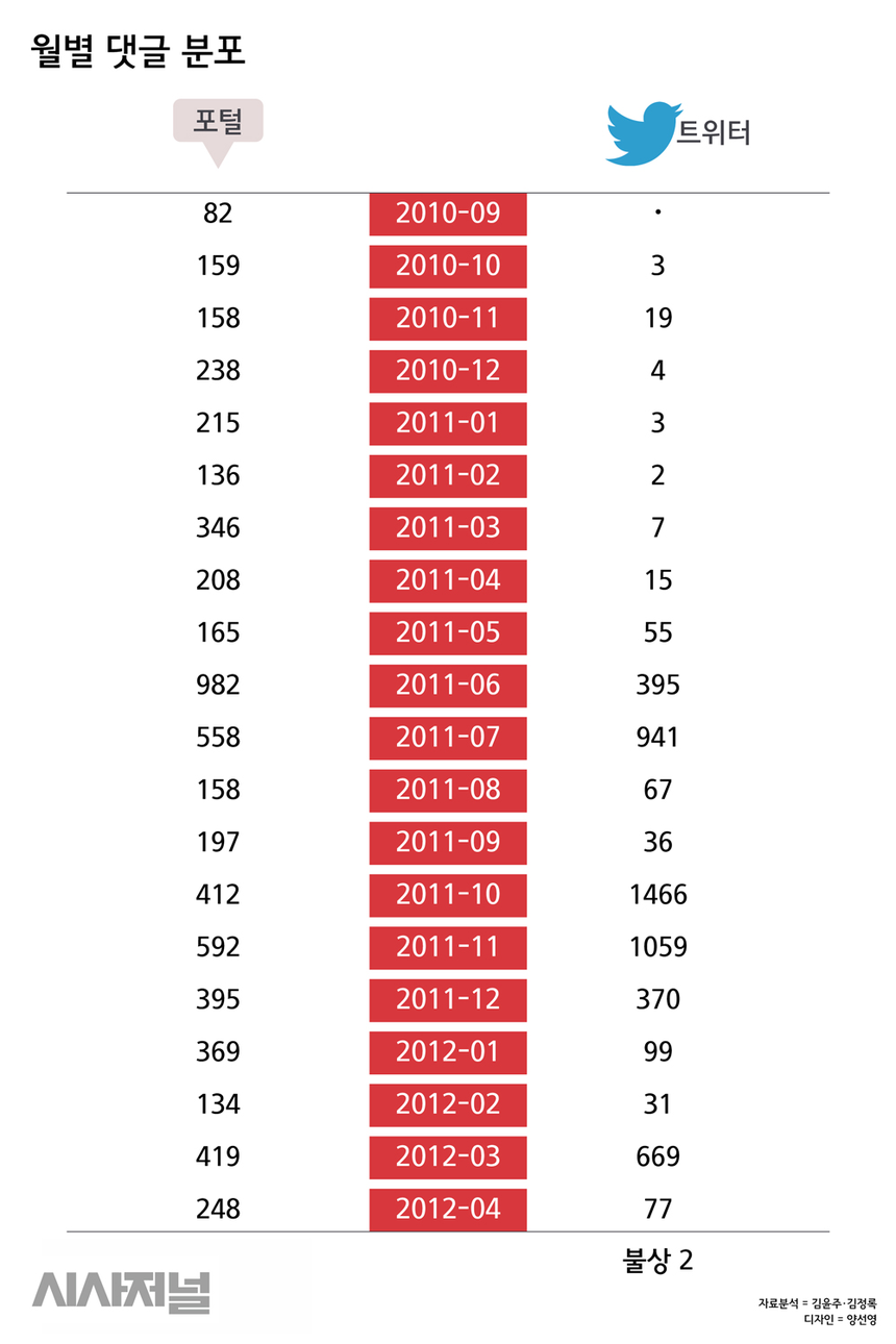 월별 댓글 추이를 살펴보면, 경찰의 집회·시위 댓글이 조직적으로 작성됨을 보여주는 정황도 포착된다. 한미FTA 비준안은 2011년 11월22일 날치기 통과됐는데, 이를 반대하는 시위는 2011년 10월부터 본격화됐다. 8,9월의 경우 경찰 댓글이 포털에서는 158건‧197건, 트위터에서는 67건‧36건에 그쳤는데 10월에 들어서면서 포털은 412건, 트위터는 1466건으로 폭증했다. 11월에도 포털과 트위터에서 592건, 1059건을 기록했다. 이는 경찰이 누군가의 지시에 의해 조직적으로 움직이지 않고는 불가능하다는 분석이 가능한 대목이다.