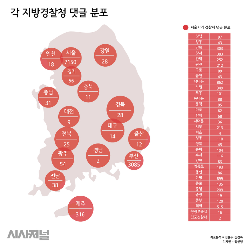 댓글 공작에 가장 적극적으로 참여한 지역은 역시 서울이었다. 이와 관련해 특수단은 “조 전 청장은 서울지방경찰청장으로 취임하자마자 비공식 사이버 여론대응 조직을 만들 것을 검토하게 했고, (이 결과) 조 전 청장의 지휘방침에 긍정적‧적극적인 마인드를 가진 지방청‧일선서 직원들 70여명으로 구성된 사이버여론대응팀(SPOL, Seoul Police Opinion Leader)을 만들었다”고 밝히고 있다. 서울지방경찰청과 서울지역 경찰서가 작성한 댓글은 7150건으로 전체의 62%를 차지했다. 이어 한진중공업 희망버스의 관할이었던 부산지방경찰청이 3085건으로 2위를 기록했다. 서울과 부산을 합하면 전체의 80%를 넘어선다.